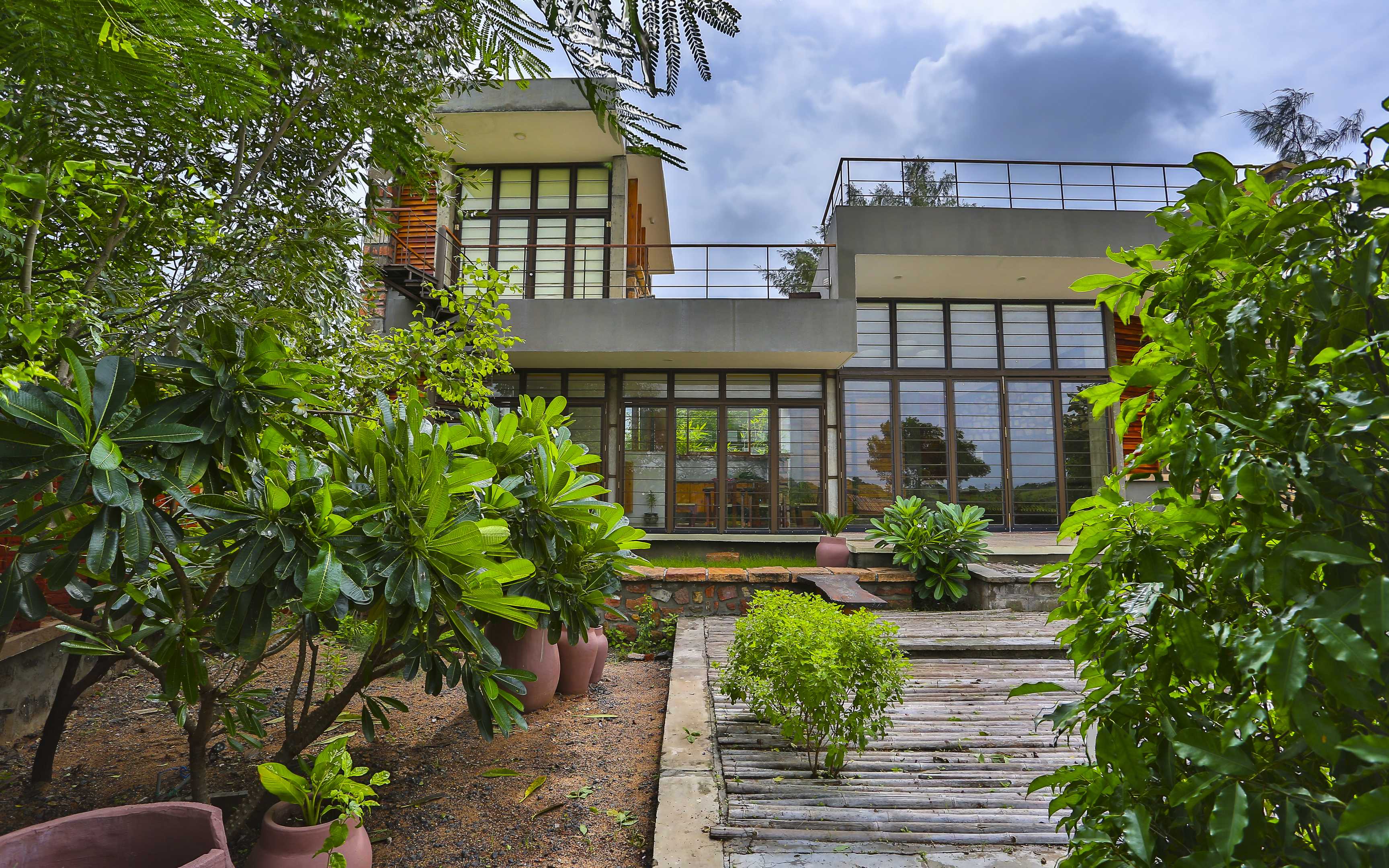 elevation of villa aaranyak – farmhouse design india by prarthit shah architectsentrance of villa aaranyak – farmhouse design india by prarthit shah architectsentrance landscape of villa aaranyak – weekend home design indiaentrance landscape of villa aaranyak – weekend home ideas indiamodern landscape design of villa aaranyak – weekend home concept indiamodern villa design by prarthit shah architects modern architecture – villa aaranyak by prarthit shah architectslandscape view from first floor bedroom – villa aaranyakwooden furniture design – villa aaranyak by prarthit shah architectslandscape design india – villa aaranyak – by prarthit shah architectsstone wall in landscape architecture india – villa aaranyak – farmhouse design ideasterrazzo flooring and teak wood furniture – farmhouse design ideas by prarthit shah architects living room – wooden louvers design – modern villa interior ideasstone wall interior – wooden door windows – modern villa design indiadinning area – wooden furniture – modern villa design by prarthit shah architects